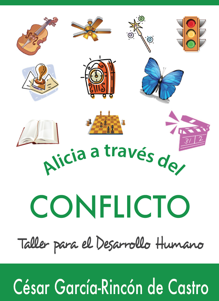 Me inspiré en la fabulosa historia de Alicia a través del Espejo, de Lewis Carroll, para escribir este taller “Alicia a través del Conflicto”. Para ello elaboré un manual con 10 unidades o temas, y cada uno de ellos con un símbolo metáfora, con los que pude hilar un argumento para crear una historia, y también una canción y un vídeo-clip.